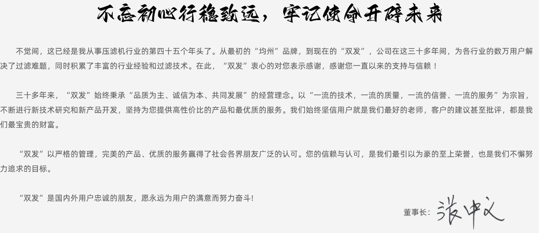 “濾污水為清泉,變污泥為凈土,還廢礦渣為青山綠地”,誠(chéng)信塑品牌,質(zhì)量出名牌。三十多年來(lái),“雙發(fā)”始終秉承“品質(zhì)為主、誠(chéng)信為本、共同發(fā)展”的經(jīng)營(yíng)理念。以“一流的技術(shù),一流的質(zhì)量,一流的信譽(yù)、一流的服務(wù)”為宗旨。不斷進(jìn)行新技術(shù)研究和新產(chǎn)品開(kāi)發(fā),堅(jiān)持為用戶(hù)提供高性?xún)r(jià)比的產(chǎn)品和最優(yōu)質(zhì)的服務(wù)。